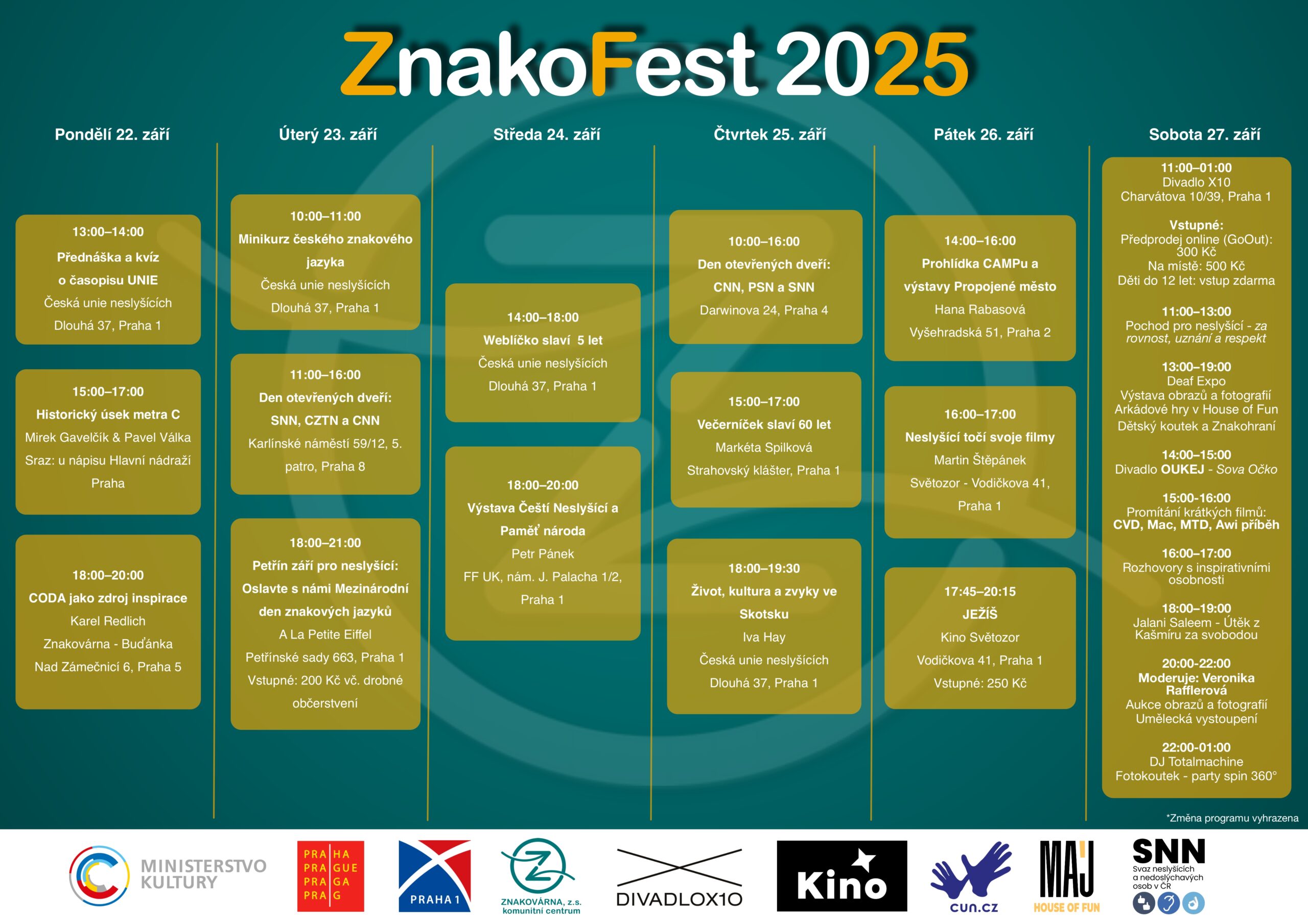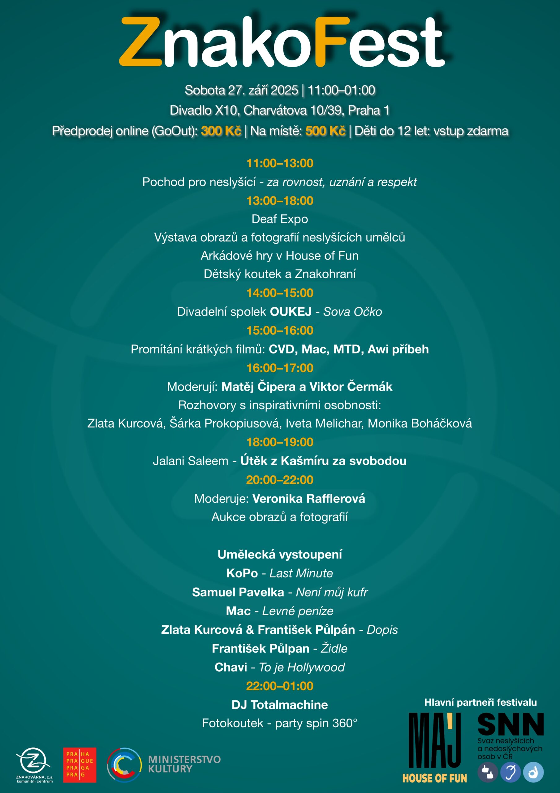 Festival. Znakový jazyk. Umění. Komunita. Expo. Přednášky. Divadlo. Aktivity pro děti.